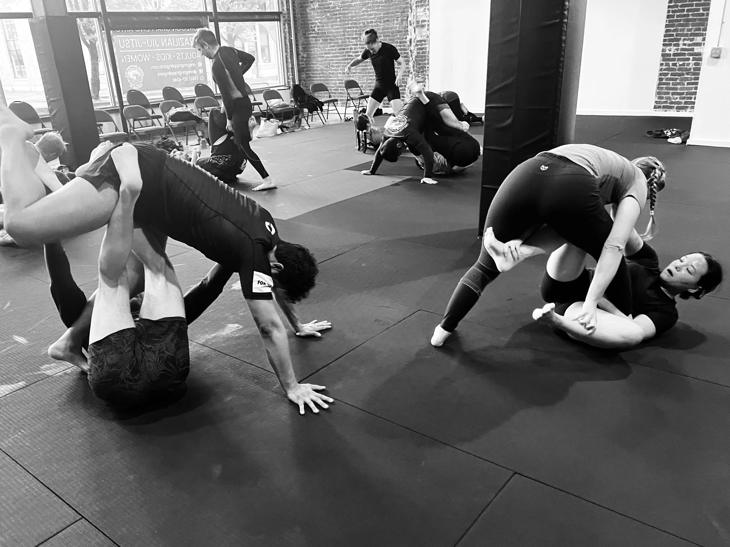 The takedowns classes at OGA are all-levels classes, meaning they are open to fundamentals students and more experienced individuals. These classes teach students how to safely and effectively bring a resisting opponent to the ground within a jiu jitsu or submission grappling context. Experienced students perform full takedowns during live sparring. Live sparring is modified for newer students to involve standing gripfighting and takedown entries.